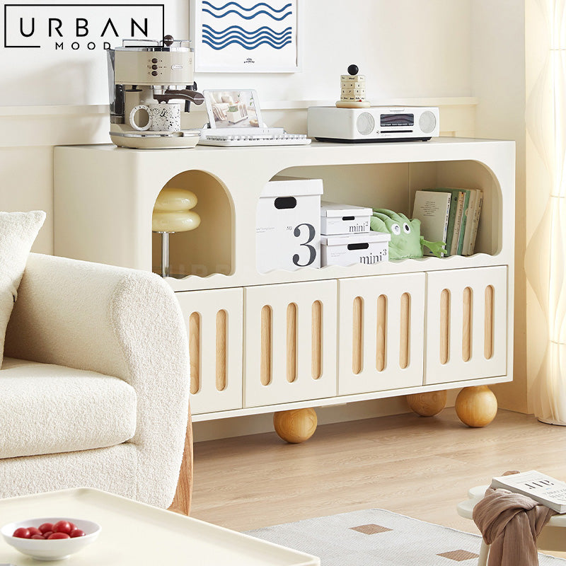 Featuring an off-white exterior in a matte finish, our HAMON cabinet is lovingly crafted from E1 high-density high-density fiberboard with contrasting oak hardware. Balancing atop wooden ball bearings, this sideboard makes an adorable addition to your home office or bedroom, while providing ample storage space for your home and work essentials, and display niches for your collectibles. A beautiful complement for Japandi, Wabi-Sabi or country-inspired spaces.