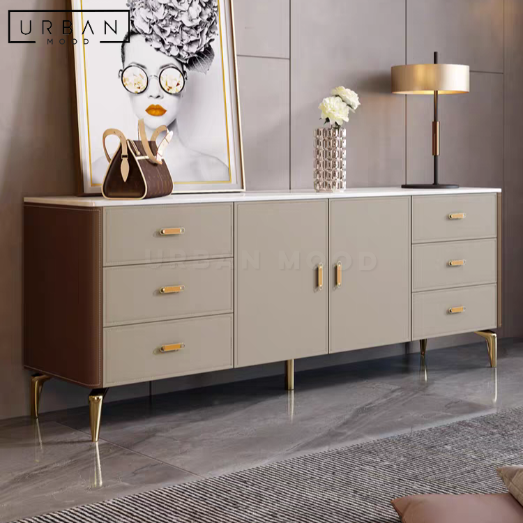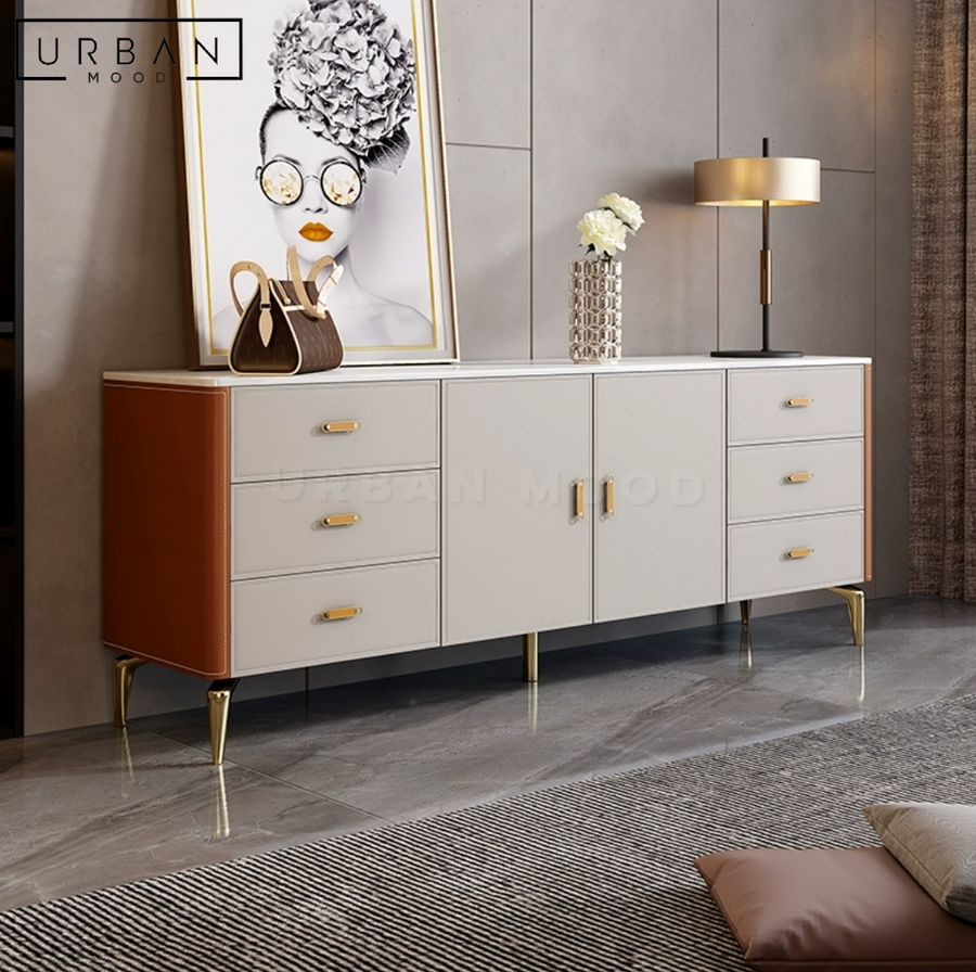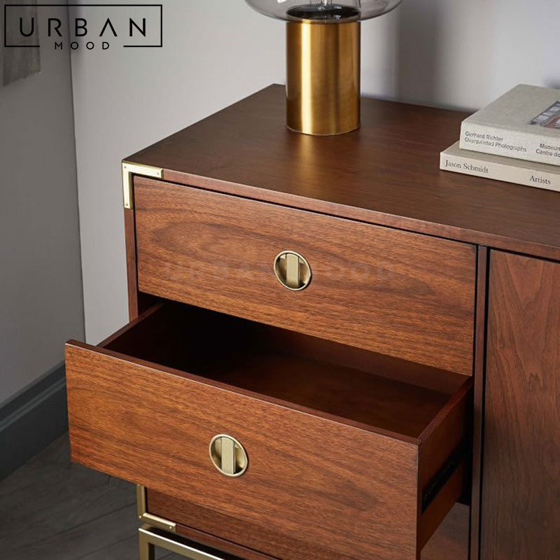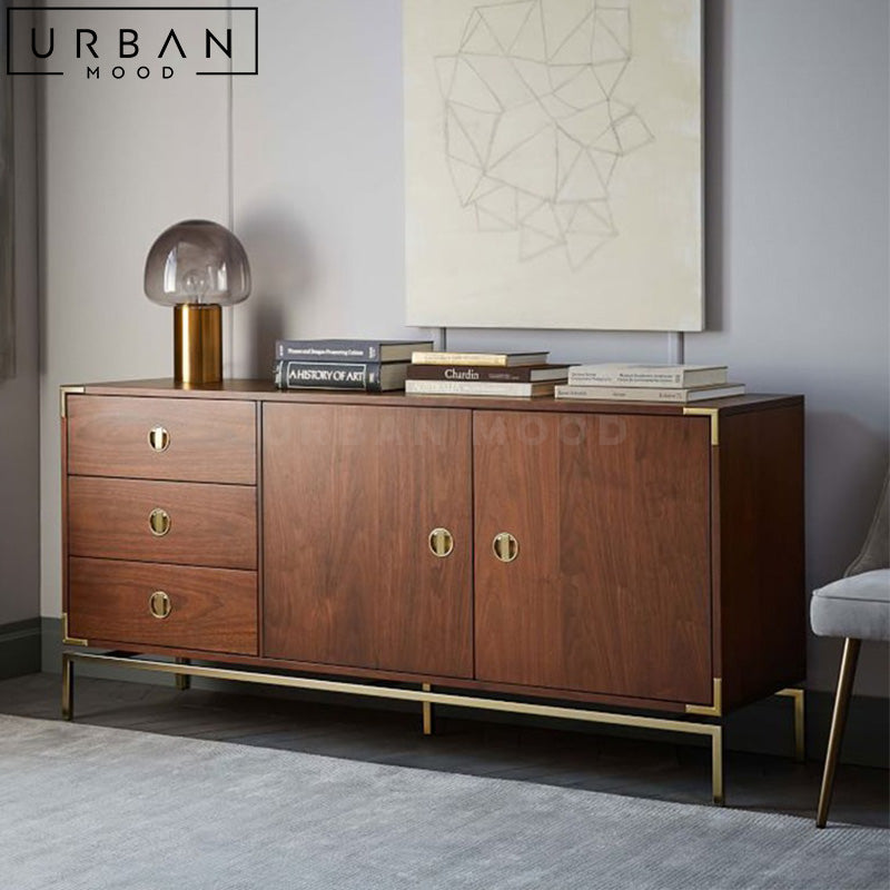 Sleek and refined in style, the JAVELIN sideboard features a scratch-proof laminate surface supported by a solid pine wood interior. Four wide drawers for your essentials sit atop thin stilted legs, lending an air of sophistication to any modern space.