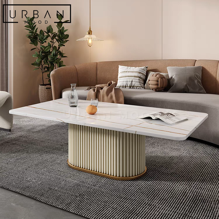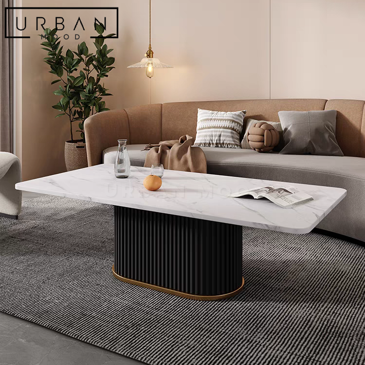 A modern twist to a classic marble design, our SPRITZ coffee table is crafted from highly durable sintered stone, known for its scratch and stain-resistant properties. The single fluted base adds a touch of elegance to the table's design while providing stability and balance. Its unique combination of modern and traditional elements makes it a versatile addition to any Victorian inspired or modern living room or office lounge.