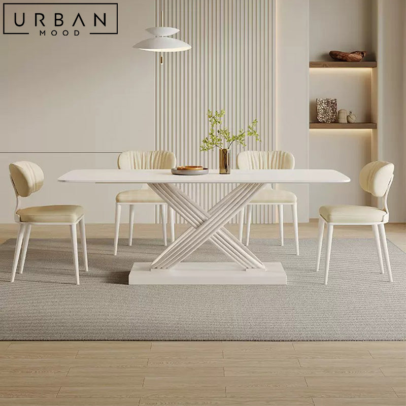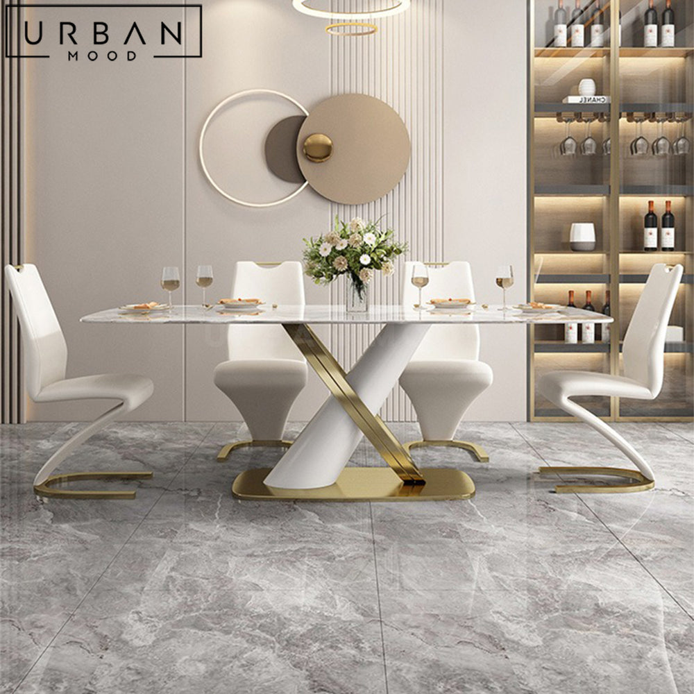 Sleek steel legs form the foundation of our FABIO dining table. Sintered stone in your choice of colour and grains run throughout the table surface, adding a touch of classic sophistication to your dining space. The extendable table ends ensures there is a spot for every guest in every occasion. Pair the table with our matching leather dining chairs for a complete luxurious emsemble.