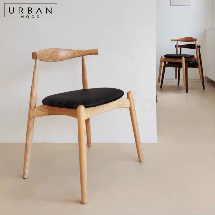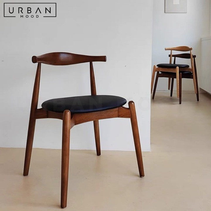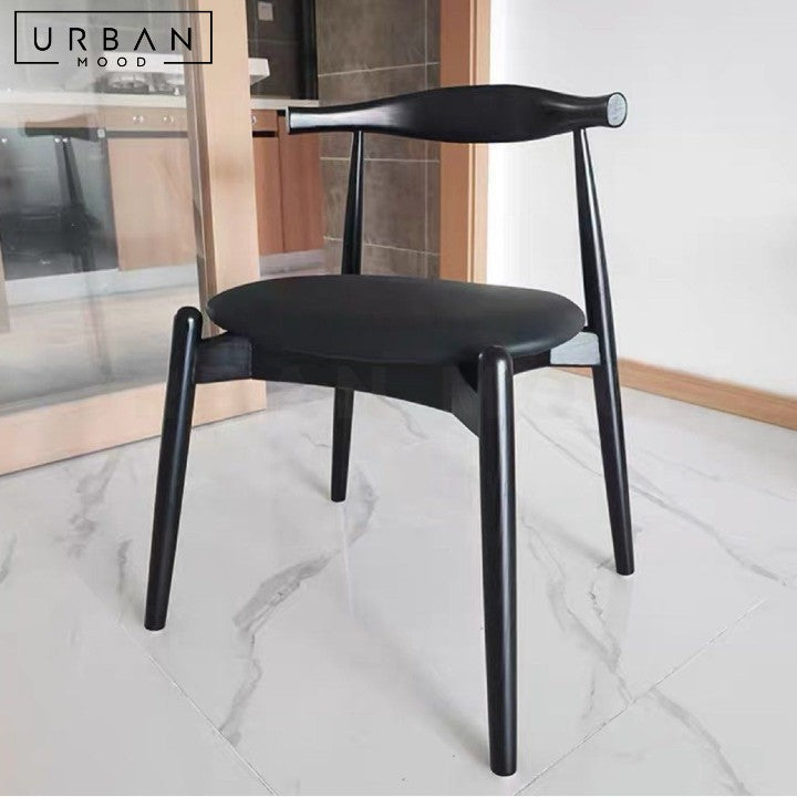 A sturdy design constructed from North American oak wood and upholstered in luxurious leather, our CLAN chair combines the classic bullhorn backrest design with a contemporary upgrade, adding an understated elegance to any modern or industrial dining or office space.