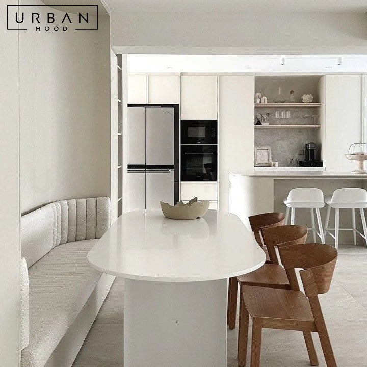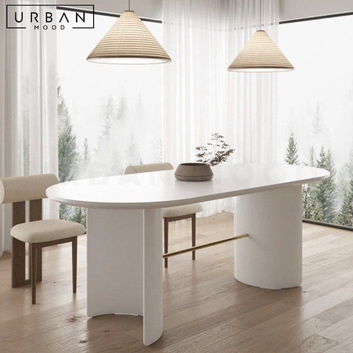 Our BOUYANT stadium-shaped dining table features crescent tamboured legs and a sleek stainless steel leg rest in champagne gold. This table combines modern sophistication with natural elegance. Crafted from sustainably-sourced eucalyptus wood with oak wood veneer, it boasts durability and style. Wrought iron legs add industrial chic, while the stainless steel leg rest provides comfort. Complete the regal look with our SNOWDON boucle dining chairs.