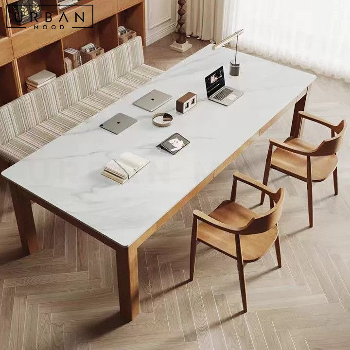 Anchor your dining space or workspace with our CHARM table, featuring a hardy sintered stone top. Ample storage is provided through built-in drawers spanning the table's length, perfect for organizing office supplies or dining essentials. Crafted with sturdy pine wood legs in a light walnut stain, this table complements modern, Scandi, and Japandi homes and professional settings, its adaptable design ensures effortless transitions from meals to meetings.