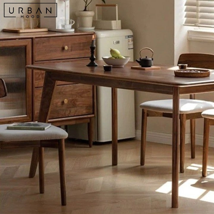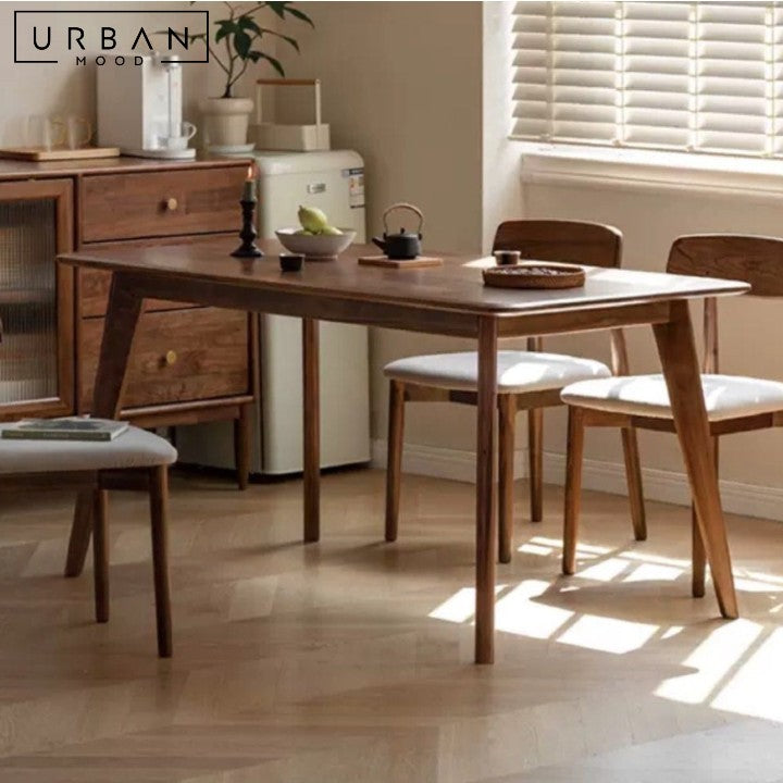 Create a warm and inviting dining space with our rustic ELLAND Japandi-style dining table, crafted from premium FAS grade walnut wood. Both the table top and legs are made from solid walnut, showcasing the natural beauty of the wood grain. The rustic, organic aesthetic adds a cozy touch to any room, while the high-quality walnut wood ensures durability and longevity. Perfect for those who appreciate the simplicity and warmth of natural wood, this dining table is a beautiful addition to any home.