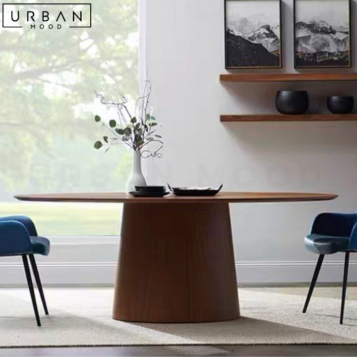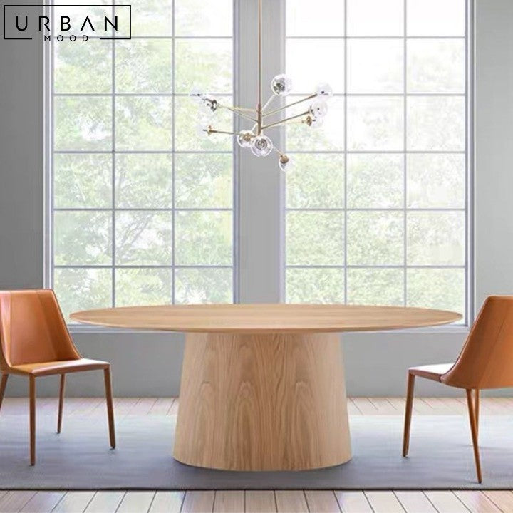 Make a statement with our HUSSEN oval dining table, featuring a wide and distinctive wooden leg base crafted from beautiful Ash wood. The unique base adds a touch of sophistication and elegance, while the oval top provides ample space for gathering and sharing meals. Available in several wood stains, its versatile design makes it perfect for those who appreciate clean lines, natural materials, and timeless beauty. A true statement piece for any modern, rustic, Japandi, or Wabi Sabi dining room or office.