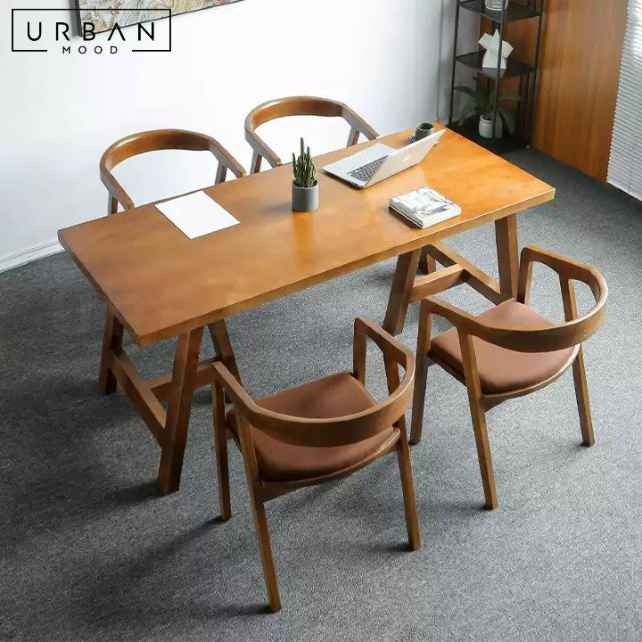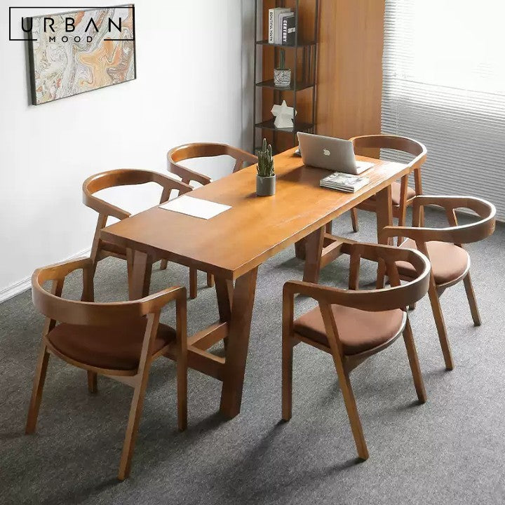 Gather around our rustic KOYAN dining table, perfect for cozy dinners or professional meetings. Crafted in a warm golden oak shade, this table adds a touch of classic charm to any room. Pair it with matching chairs for a cohesive look. Plus, customize the color to fit your unique style. Ideal for rustic, farmhouse, or traditional decor.