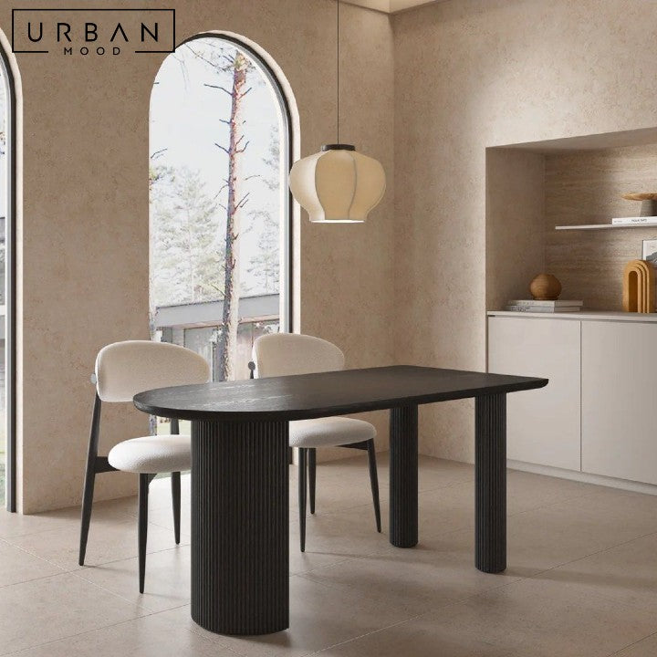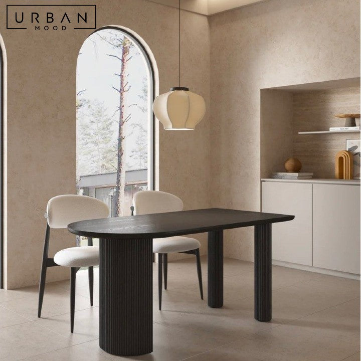 Perfect for modern homes, our LABELLE table combines Japandi design influences and functionality. The eucalyptus wood grain and black legs create a striking contrast, adding warmth and sophistication to any room. Its half-stadium table top allows the table to be flush against any wall, perfect for compact spaces. Complete the look with our Elisabeth boucle dining chairs.