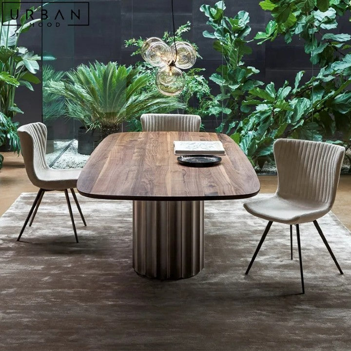 Anchor your dining space in style with our MORTY dining table. Crafted from exquisite black walnut wood, this Italian-inspired table showcases the natural warmth of nature encapsulated in a rounded rectangular table top. Its refined design and distinctive louvered base make it a captivating centerpiece for any modern or rustic dining room.