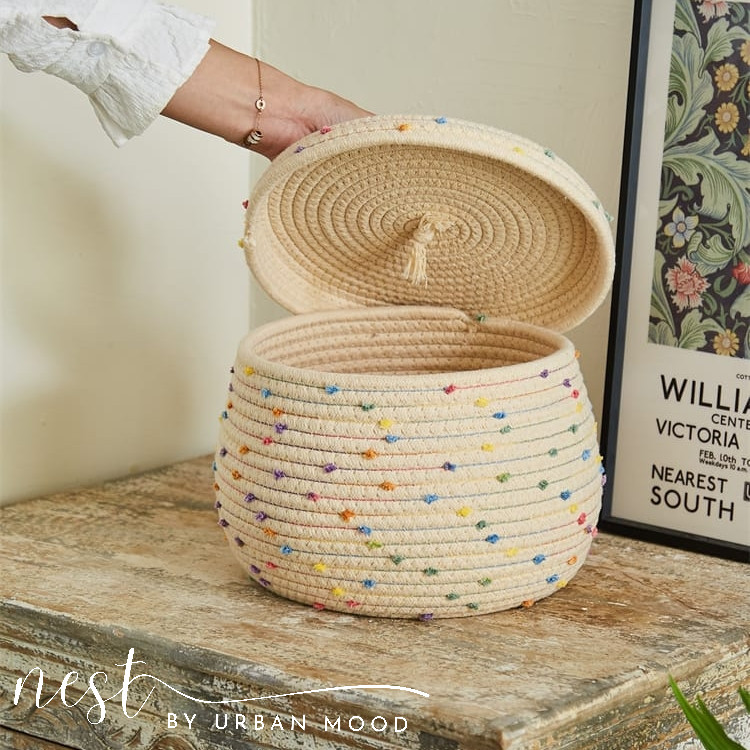 A whimsical woven basket studded with rainbow spots resembling hundreds and thousands sprinkles, this beautiful round storage basket makes for good cheer while ensuring your balls of yarn or clean socks are stowed away from sight.