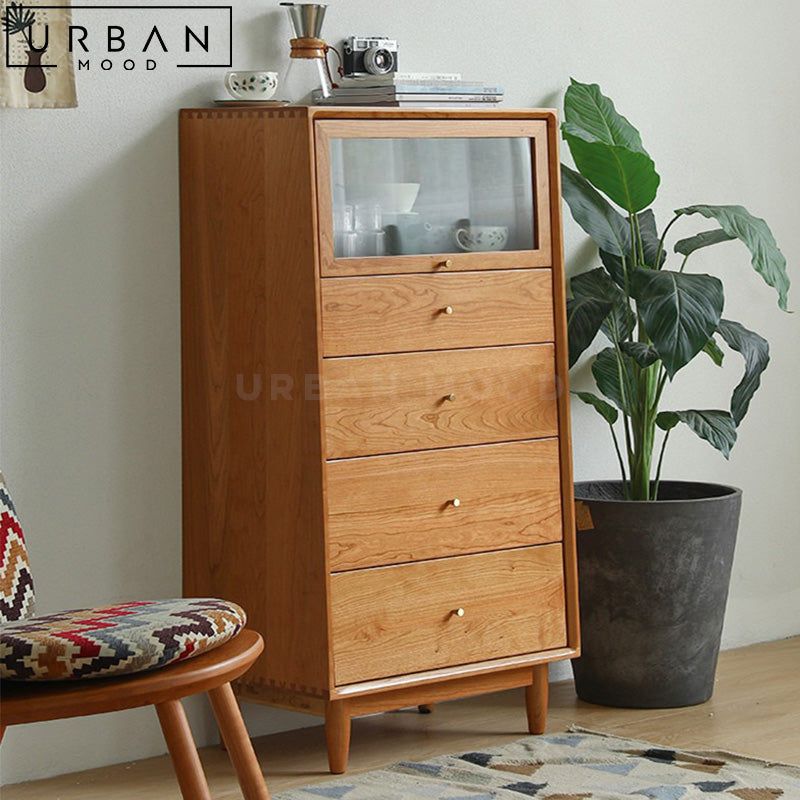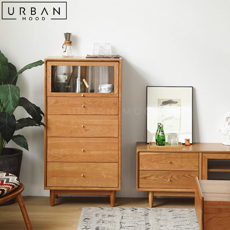 Redefine your living room or hallway with our BIRNEY display cabinet, crafted from durable pine wood in a golden maple hue. This clean-lined cabinet features a display shelf with a transparent flip door and sleek drawers with ample storage space for your linen, kitchenware, or utilities. Display your collectibles in style, and utilise the surface area for your key fobs and accessories. This accent cabinet will anchor your hallway or living room in Japandi or rustic beauty.