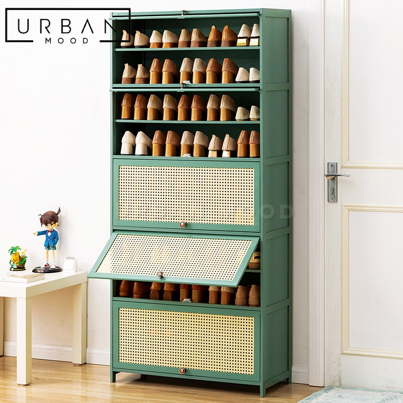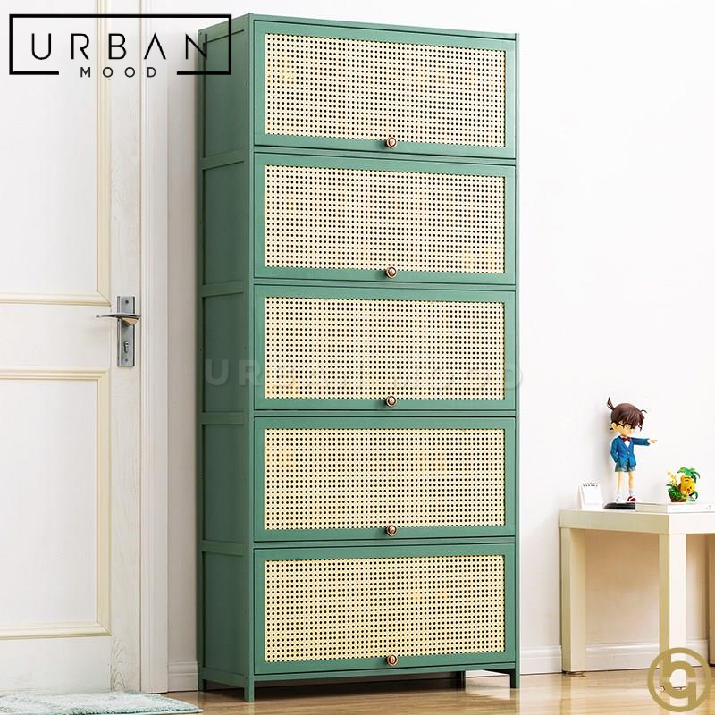 Featuring rattan flip top doors and double tiered shelves, our BROWNS storage cabinet functions a a stackable shoe cabinet, bookshelf or kitchen cabinet with its ample and deep storage space. Choose between pastel green or classic walnut to complement your eclectic or rustic interior theme