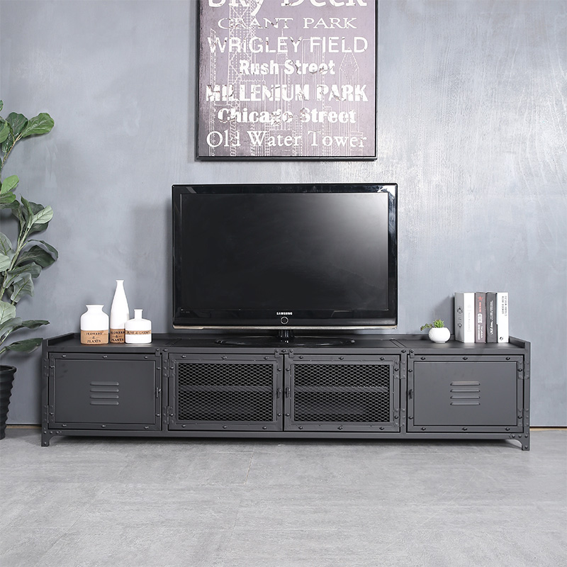 A full matte black metal frame paired with raw cut solid wood slab, this masculine TV console doubles up as a sideboard for extra storage.