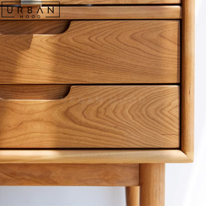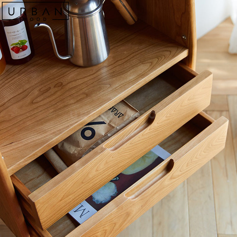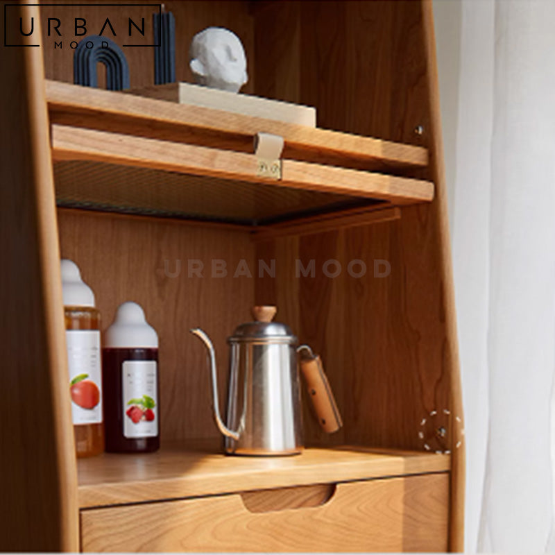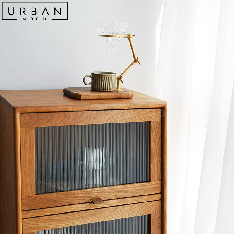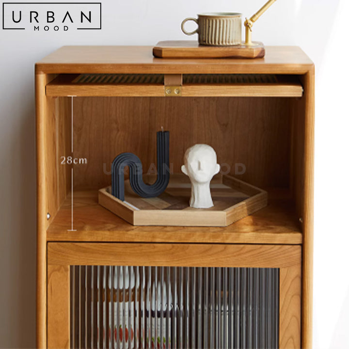 DAVID display cabinet, crafted from durable pine wood in a golden maple hue. This clean-lined cabinet features a display shelf with a transparent flip door and sleek drawers with ample storage space for your linen, kitchenware, or utilities. Display your collectibles in style, and utilise the surface area for your key fobs and accessories. This accent cabinet will anchor your hallway or living room in Japandi or rustic beauty.