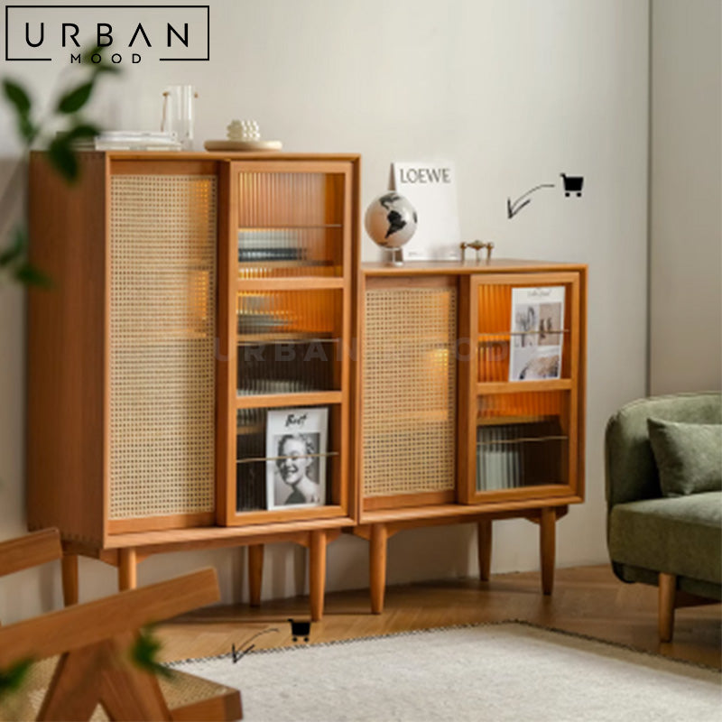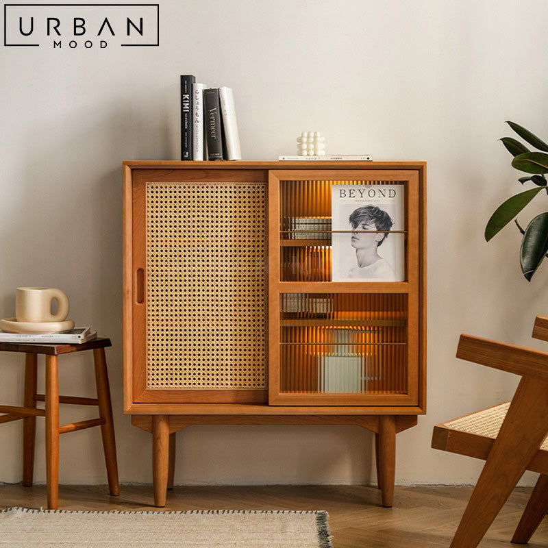 A versatile storage solution that can be placed in the hallway, living room, kitchen, or bedroom, our PONDER cabinet offers a multitude of practical uses that enhance both functionality and aesthetics. Featuring a sliding rattan door that opens to reveal ample shelving space, this storage unit will prove to be a handy organization solution for home essentials. Utilize it as a stylish bar cabinet, displaying your favorite spirits and glassware, or as an elegant storage unit for books, magazines, and decor pieces. The rattan door adds a touch of texture and visual interest, making it perfect for concealing clutter while maintaining an inviting atmosphere. Additionally, the cabinet can serve as a hallway catch-all, a bedroom nightstand with extra storage, or a charming accent piece in any Japandi, Scandinavian, or cottage-inspired spaces.