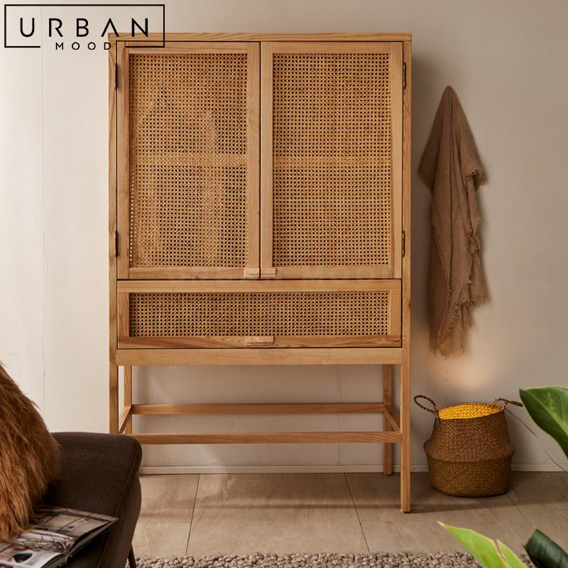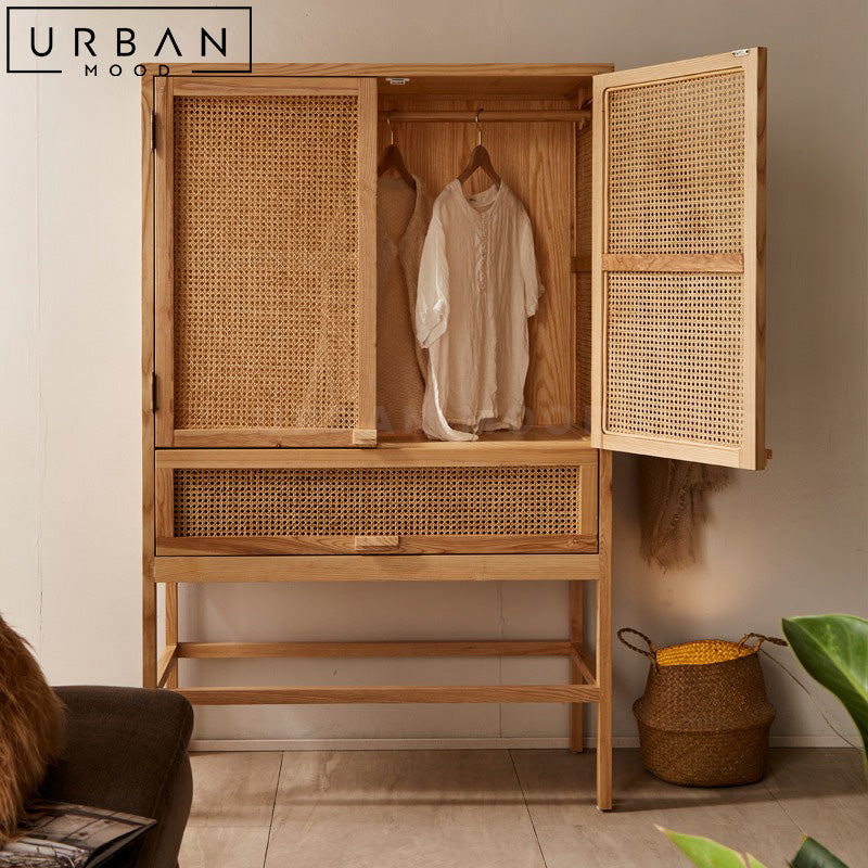 Boasting the finest craftsmanship and materials, our VIVIAN wardrobe is crafted from premium ash wood and showcases intricately woven rattan doors. Balanced atop raised wooden legs, the doors item to reveal ample storage space for your linens and clothing. Its warm oak finish draws nature into your private sanctuary, providing a sense of natural wellbeing. Complete the rustic look with our KNOTS rattan standing lamp and ARAMIS rug.