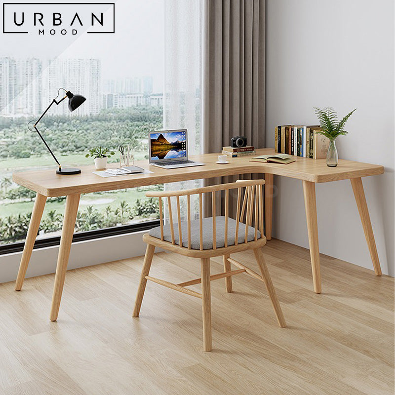 Turn your workspace into an aesthetically pleasing and high performing sanctuary with our DEWITT study table. With a pine wood table top and tapered wooden legs providing stability and a touch of elegance, this work desk comes complete in a light oak finish that adds warmth and charm to your workspace, creating an inviting environment for productivity. The L-shaped configuration maximizes your workspace efficiency, making it ideal for both home and office settings. The organic wood grains and knots add to the beauty of the table, and accentuates any modern, minimalist, Scandinavian, or Japandi study room or office.
