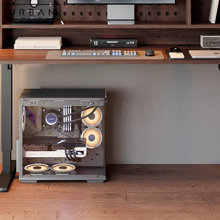 The perfect gaming or working desk for serious gamers and casual players alike. Crafted with a pine wood surface and reinforced metal legs, the electric table comes with settings for adjustable height levels, offering a stable platform for intense work or study sessions. Its sleek design complements contemporary setups, while the integrated pegboard and overhead cabinet layout accommodates multiple monitors, accessories, and gear.
