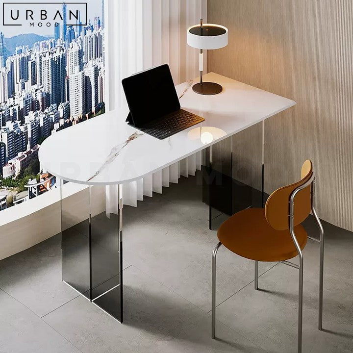 Our TONA office desk brings a contemporary edge to any office or study area with its sintered stone top and distinctive glass legs in an ombre hue. With its durable materials, it offers long-lasting reliability and ample workspace for productivity. The minimalist style and functional features make it a versatile addition to any modern or minimalist workspace. Upgrade your office setup with this work desk, providing a practical and stylish solution for a productive work environment.
