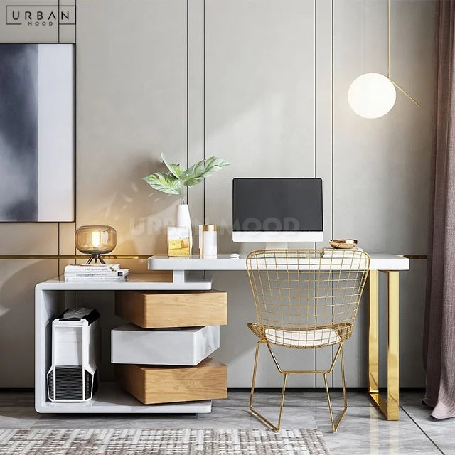 Redefine your workspace with our versatile YVETTE study table, featuring an adjustable side table that adds flexibility to your workspace. Accompanied by a chest of drawers that swivels, this multifunctional masterpiece maximizes storage and adaptability. Whether for a home office or a student's study nook, this table effortlessly complements modern, minimalist, and contemporary interior settings.