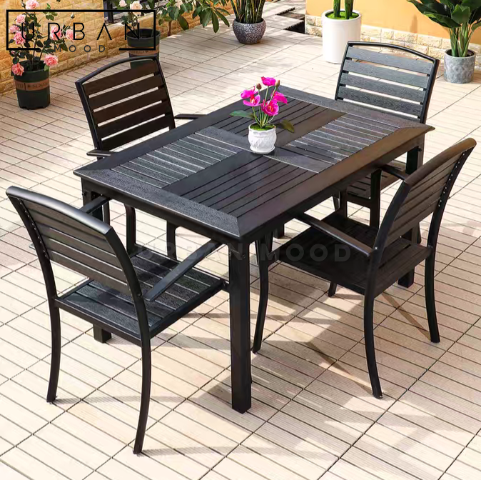 Enjoy alfresco dining with our CARDI outdoor dining table and chairs! Crafted from highly durable wood plastic composite, this dining set is waterproof and fire-resistant, making it the perfect choice for bearing extreme weather elements. The matte black finishing adds a touch of sleek simplicity to any modern or minimalist backyard or balcony. Complete the look with our planters and candle holders for a romantic date night or family gathering.