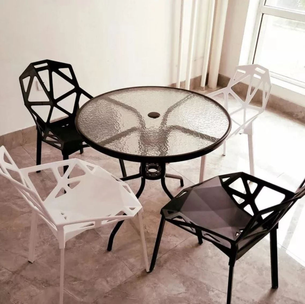 Crafted to brave the elements of rain and shine, the Valen outdoor set features a frosted glass table surface and powdercoated metal base. ABS plastic chairs with a designer backrest complete the look, and add an accent of postmodern creativity.
