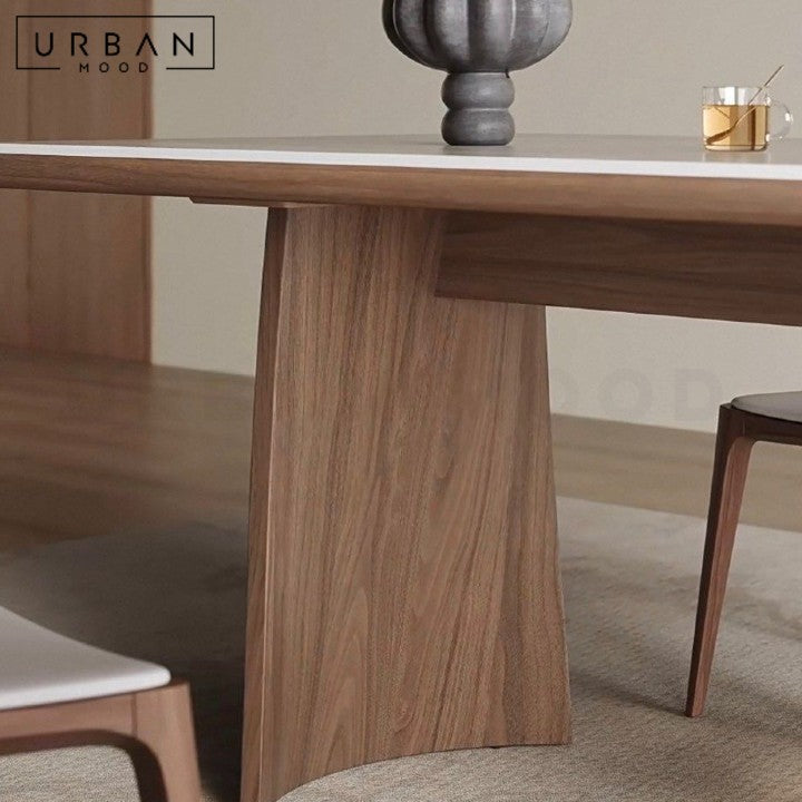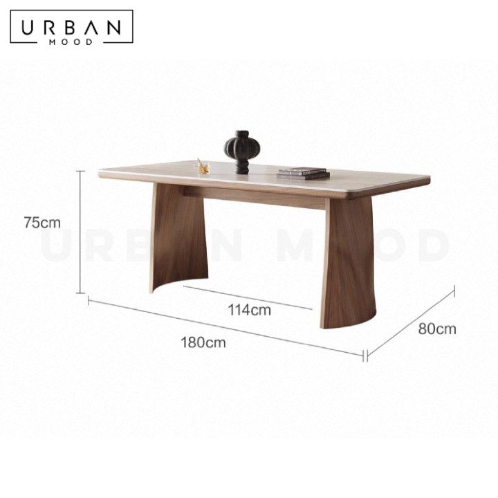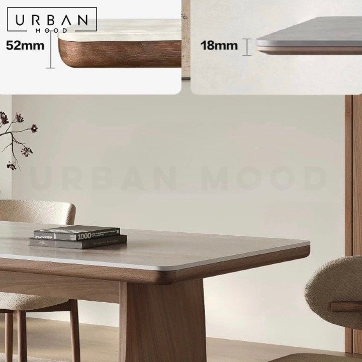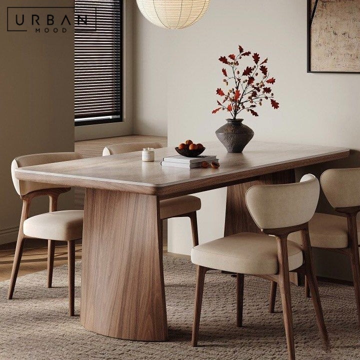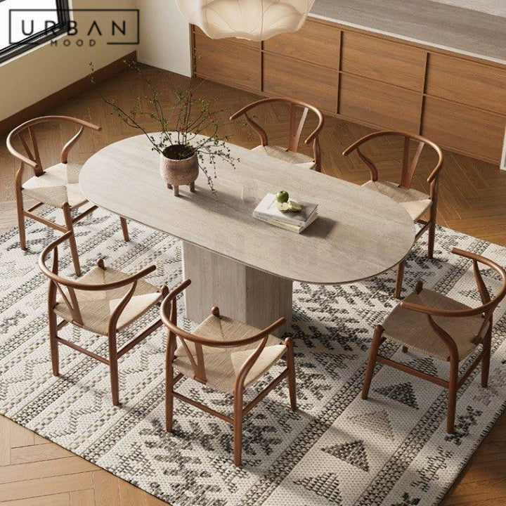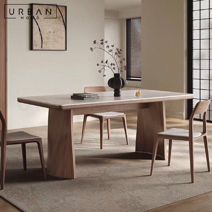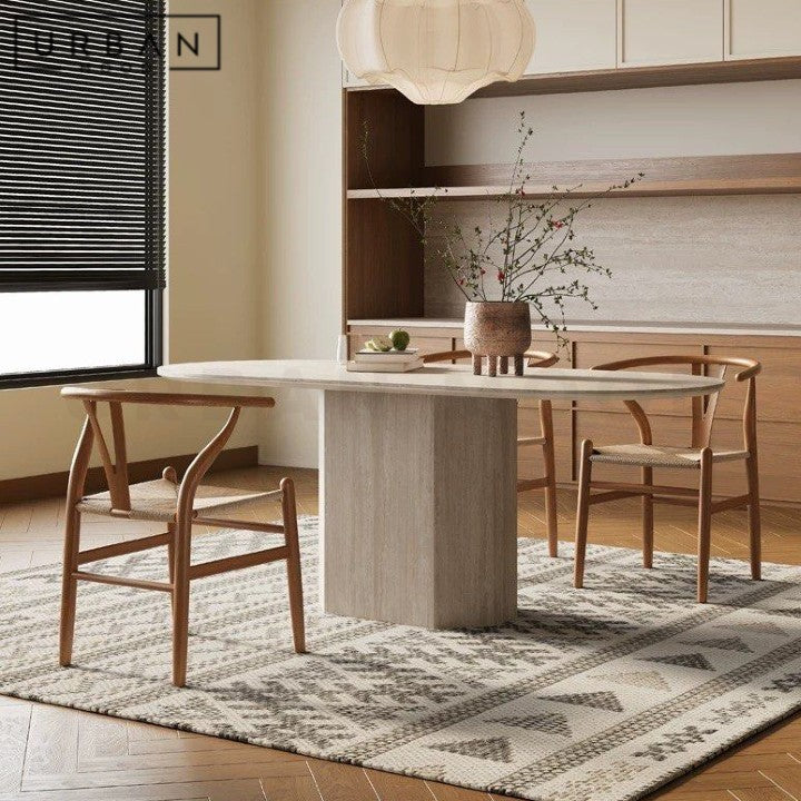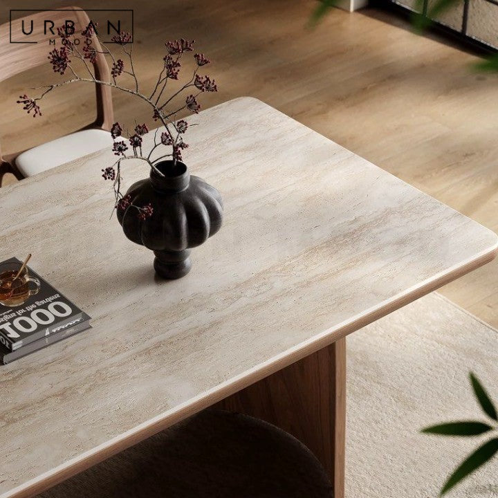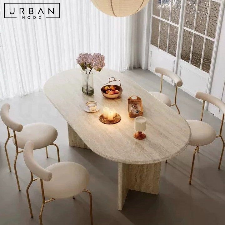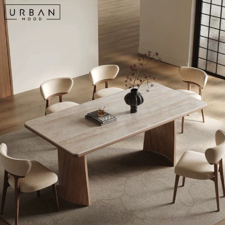 Our VATA dining table is designed for memorable dining experiences. Featuring a sintered stone top in a travertine-inspired finish, this designer table combines the beauty of natural stone with outstanding durability. Crafted to last, this table is built with high-quality sintered stone and oak wood. Create lasting impressions with this dining table, perfect for any modern, Wabi Sabi, or Japandi dining space.