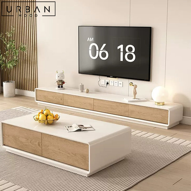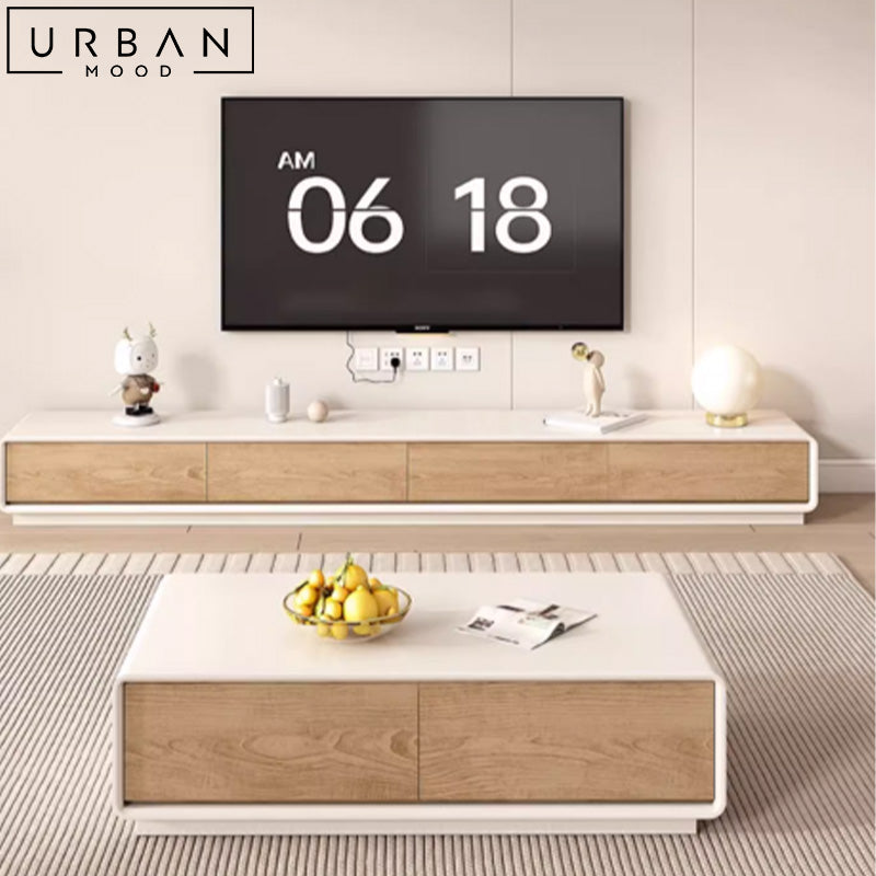Revamp your space with our ABSIN modern TV cabinet & coffee table. Made from durable fiberboard in a beautiful oak finish, this living room set seamlessly complements contemporary, minimalist, Japandi, Scandinavian, and Wabi Sabi interiors. Featuring drawers running along its entire length, this console provides spacious storage for your media accessories and more. Its warm palette adds a calming touch to your living space.