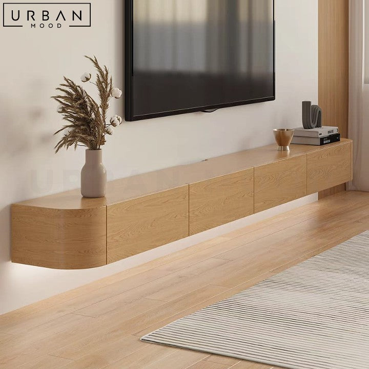Enhance your entertainment area with out MAFTEI floating TV console, embodying Japandi elegance and functionality. Crafted from durable rubber wood, this console offers both style and reliability. Its modern design effortlessly complements any decor, while the solid wood construction ensures longevity. With ample storage space for media essentials, it's perfect for organizing your entertainment setup.