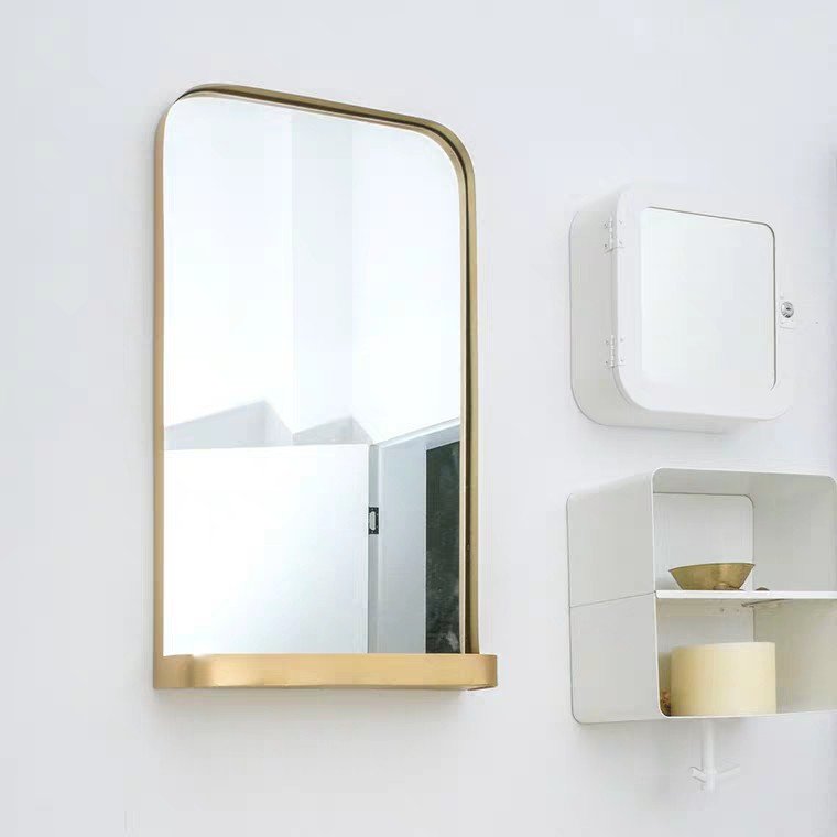 Featuring a beveled gold frame, this gorgeous wall mirror is a work of art and function in your bathroom or atop your dresser, with a rounded corner gold tray for your necessities and beauty products. This timeless design complements modern, contemporary, vintage, or hollywood interior themes.