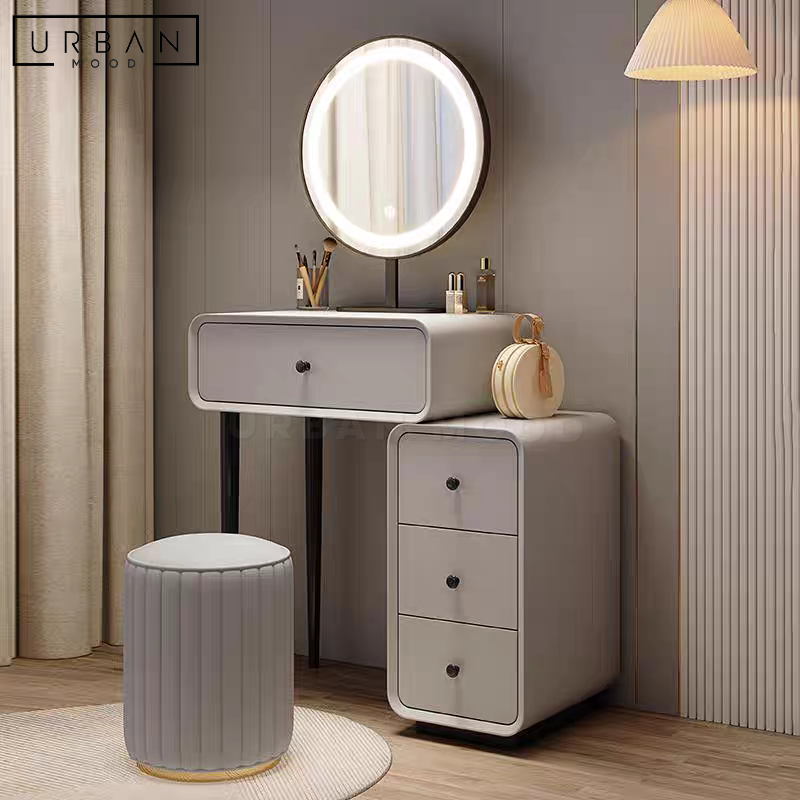 Prepare for and unwind from your day with our ASTRO vanity table set in a soothing neutral nude palette. Featuring contrasting hardware in black for a pop of contemporary style, this dressing table comes with a chest of drawers for your beauty essentials and accessories. Switch between cool, warm and daylight temperature on the LED mirror to create the ambience you need. This versatile and multifunctional design will complement any modern, hygge, or minimalist bedroom settings.