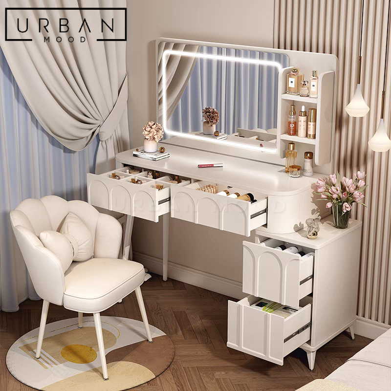 Set in matte ivory, our EDITH dressing table comes with a wide LED vanity mirror, shelves, chest of drawers and a matching chair. An all-inclusive dressing set that ensures your beauty products and accessories are kept away neatly. Illuminate your day and night routine while adding a hygge or minimalist accent to your walk-in closet or vanity area.