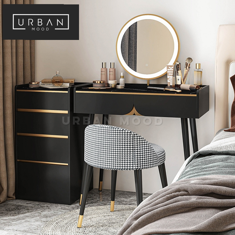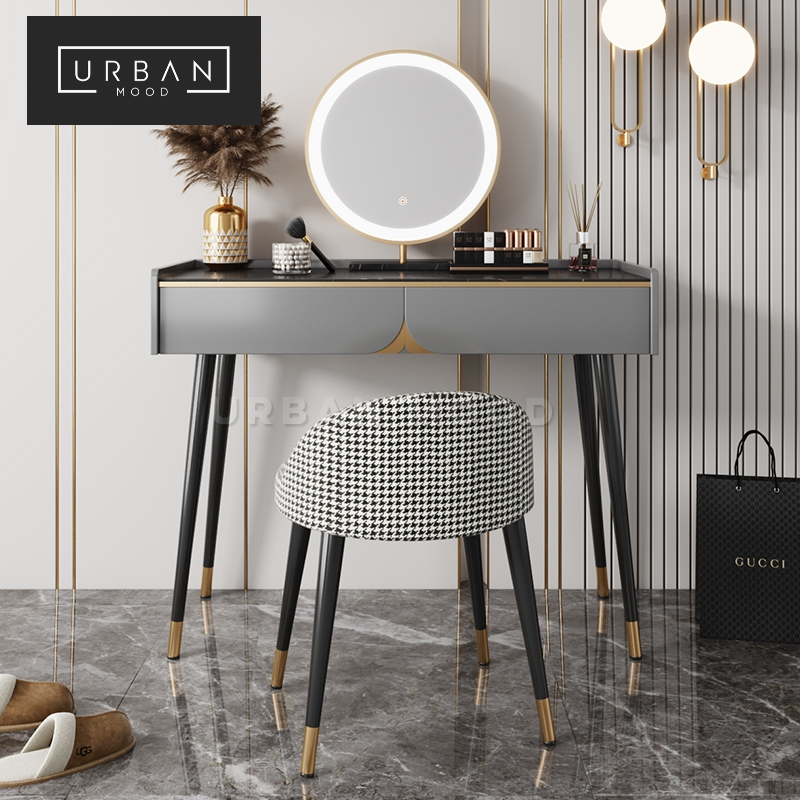 A luxurious design featuring a spacious, smooth and matte slate top, and gold trimmings which lend an air of classic beauty to the dressing table. The vanity table comes with a tri-colour LED mirror, and a beautiful matching stool. A perfect addition to your walk-in wardrobe or bedroom.