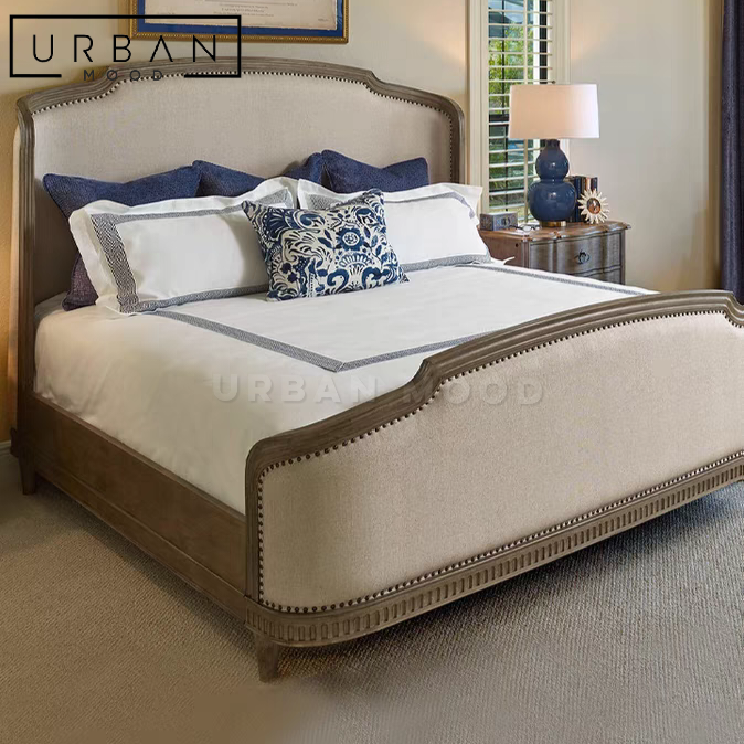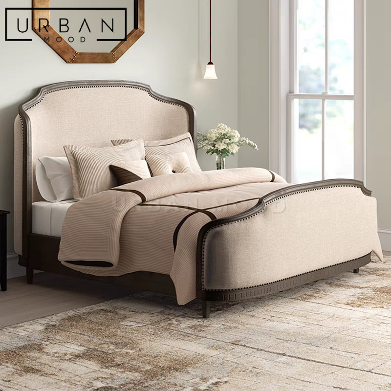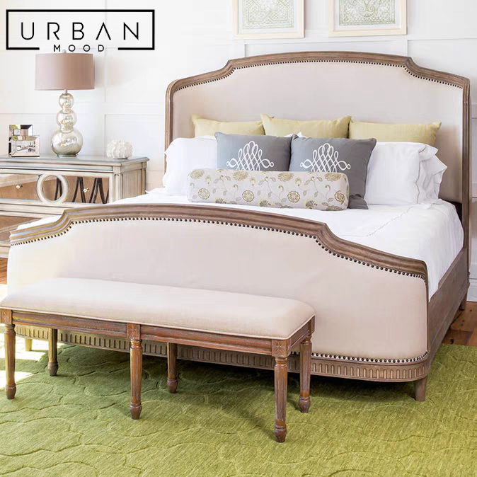 Anchor your bedroom in style with our MYRTLE bedframe. Framed in pine wood with a distressed finish and upholstered in generously padded fabric, the headboard and footboard feature a subtle medieval arched border, lending your bedroom an air of refined elegance. Evoke the Edwardian and Victorian spirit with this bedframe and complete the look of luxury with our COEN tufted bench.