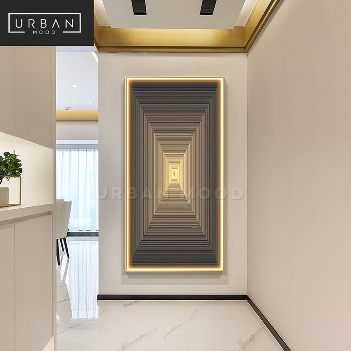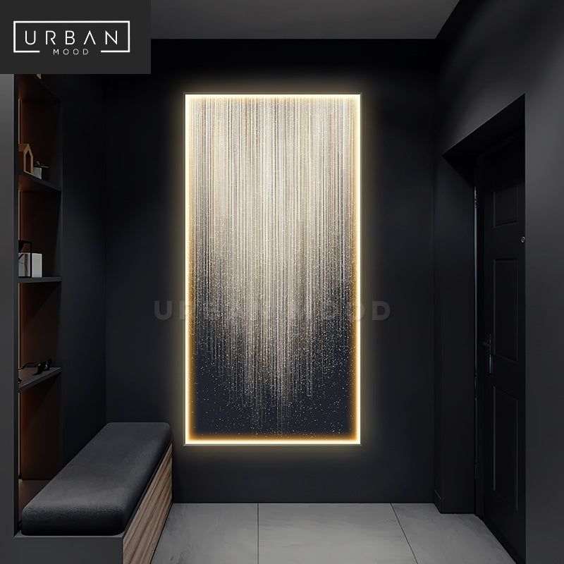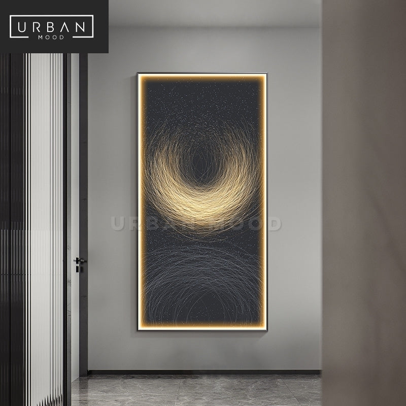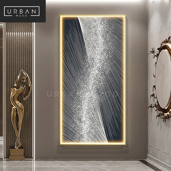 Turn heads with the THEORY wall art, a captivating design featuring shimmering rays against a contrasting matte black backdrop. This beautiful artpiece illuminates any hallway, office, or living room. Set the ambience right with either cool or warm LED light temperature, and let the calming and invigorating energy of this wall art infuse your room.