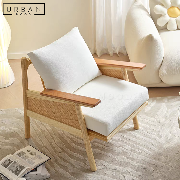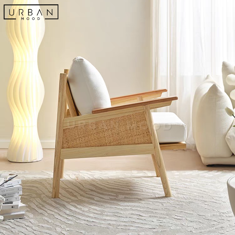 Crafted from high quality ash wood, our RODEX reading chair radiates timeless appeal, adding warmth to any living room, lounge room, or balcony. Featuring a rattan backrest and armrests that exude organic elegance and plush fabric seat and backrest providing utmost comfort, this lounge chair allows you to sink into relaxation for long hours of conversation or reading. Complete the old school look with our KNOTS rattan standing lamp and ARAMIS rug.