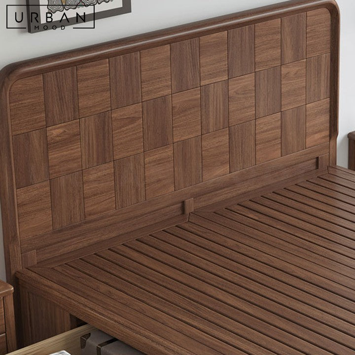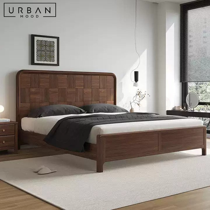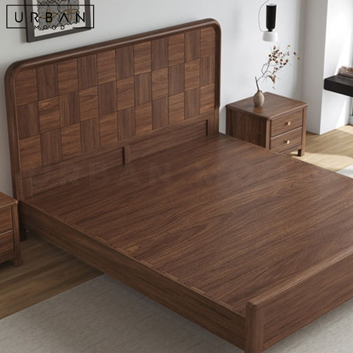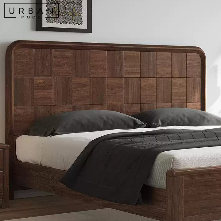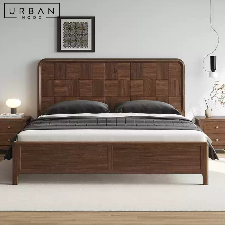 An interesting combination of rustic and contemporary design influences, our ARACELI bed frame features an intricately designed black walnut wood headboard in a walnut finish, enhancing the aesthetic of any bedroom while providing sturdy, long-lasting support. Its rich, dark hues complement rustic, vintage, farmhouse, and contemporary decor. Complete the look with our matching bedside table.