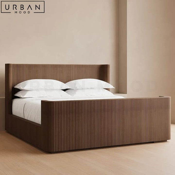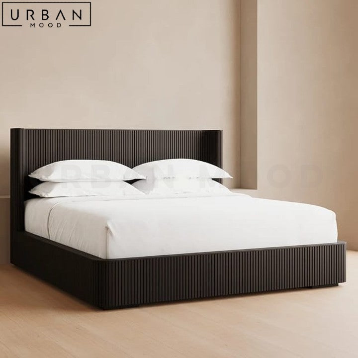 Crafted from highly durable oak wood, our FLOW bedframe combines sleek design with durability. The high slatted headboard adds visual interest, while the platform construction eliminates the need for a box spring. This bed seamlessly complements any contemporary, Japandi, or Hygge bedroom with its clean lines and quality materials.