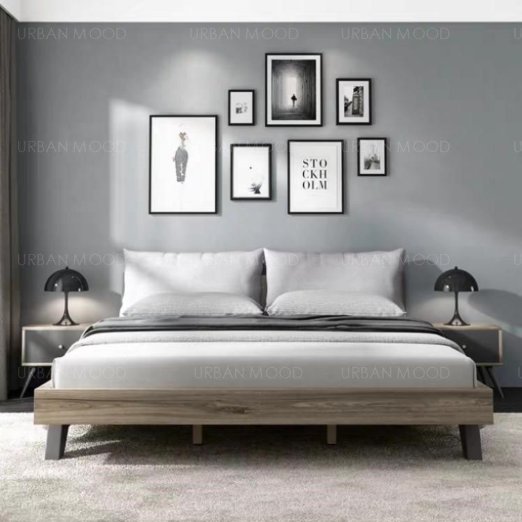 A beautiful addition to any modern rustic or industrial themed interior with a solid pine wood frame wrapping the bed, supported by slanted bases with an edge. Comes with two large supporting headrest cushions.