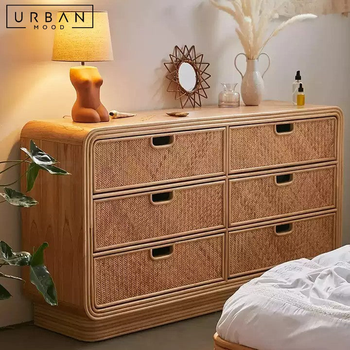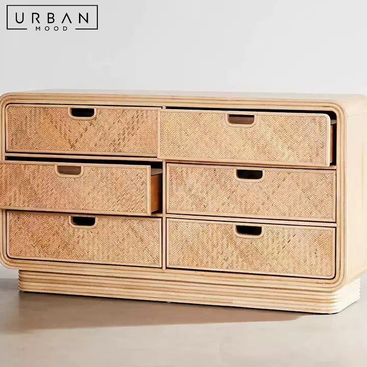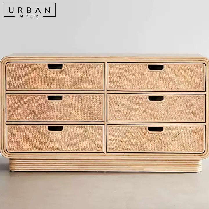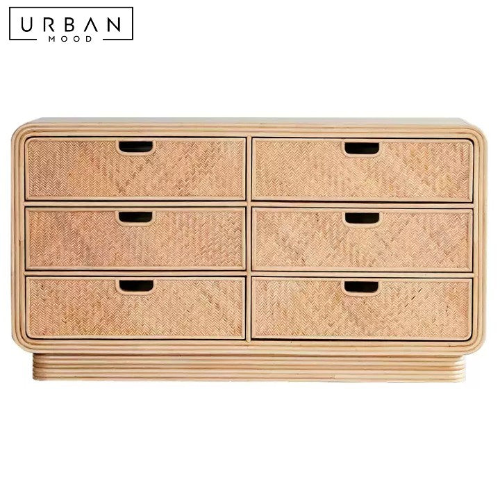 Infuse your living space with the natural warmth of our ADKINS chest of drawers, crafted from organic rattan. This storage cabinet adds texture and the beauty of nature to any hallway, dining room, or bedroom. Ample drawer space provides practicality without sacrificing aesthetics. This design complements rustic, farmhouse, and Japandi decor.