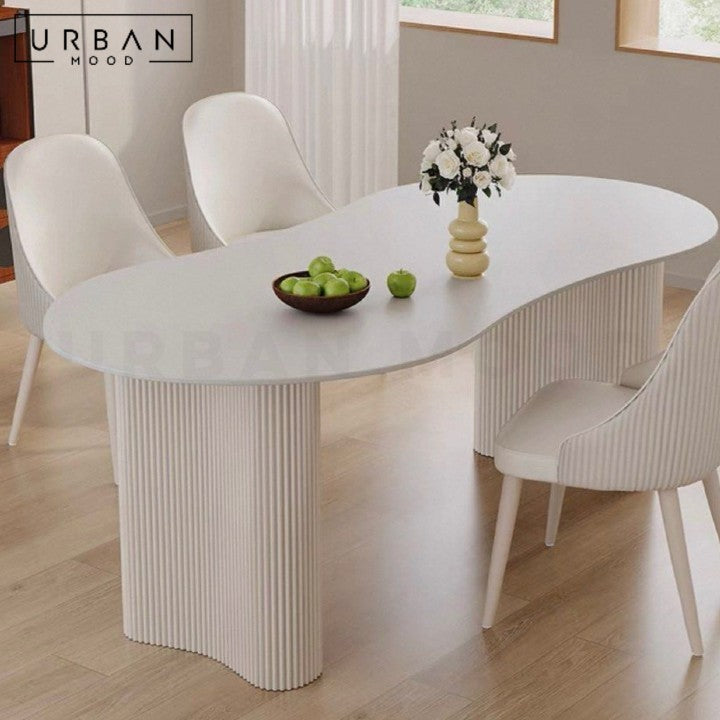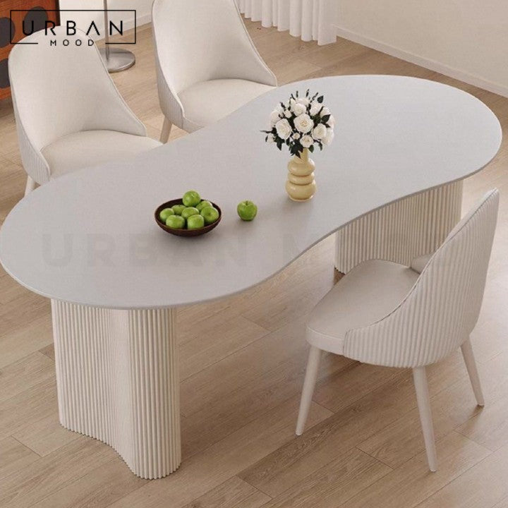 Designed with a curved bean-shaped tabletop, our ADRIANA table is crafted from sintered stone, offering scratch, stain, and heat resistant properties, making it an excellent choice for everyday use. Supported by a sturdy powdercoated iron base in a tamboured exterior, this minimalistic design soothes the senses while ensuring the safety of children.