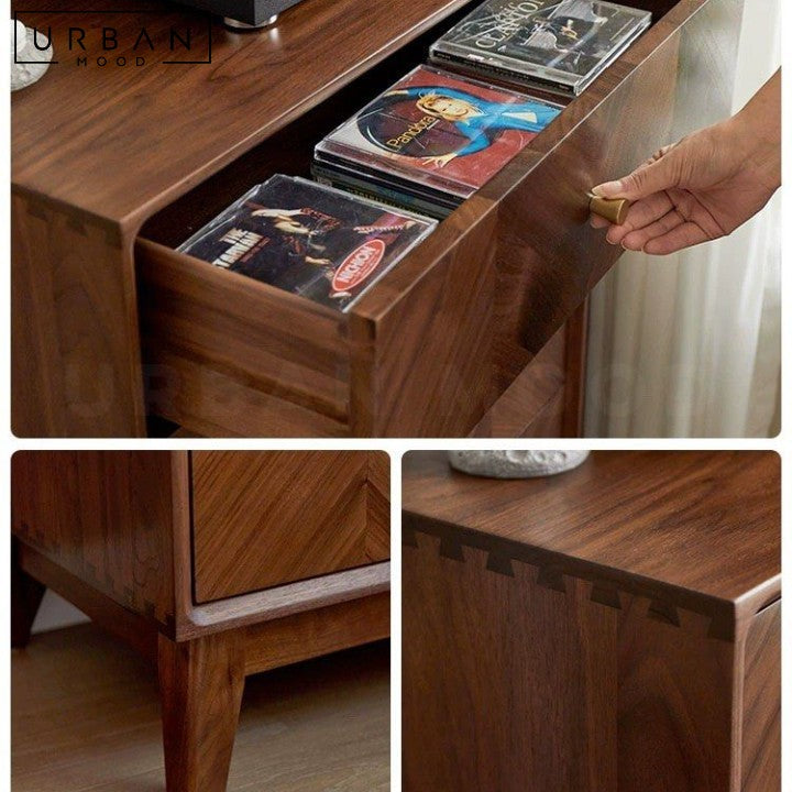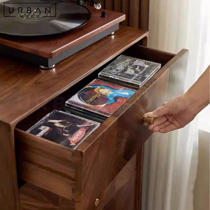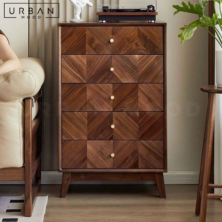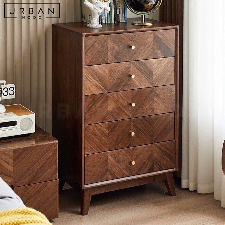 Bring warmth and sophistication to your bedroom with our ANTONIO tall chest of drawers crafted from stunning North American walnut wood. The vibrant wood grain design showcases the natural beauty of the wood, evoking the classic style of mid-century furniture. With ample storage space and a sleek, vertical profile, this chest of drawers is perfect for keeping clothing and personal items organized while adding a touch of timeless elegance to your home décor.