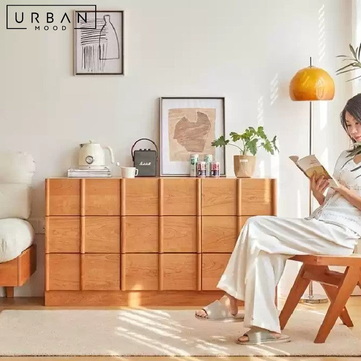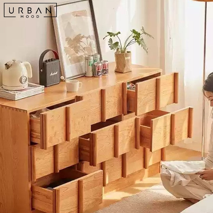 A Japandi twist on classic American design, this beautifully crafted chest of drawers will fit in any foyer, living room, or bedroom. The rich cherry wood finish and unique board and batten exterior create a perfect blend of modern and rustic charm. Made from high-quality ash wood, this chest is built to last and features ample storage space for your belongings. Its Scandinavian-inspired design brings a sense of calm and serenity to any room.