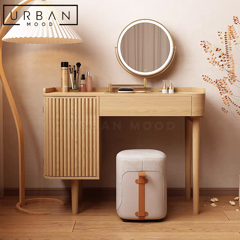 Enjoy your day and night routines in style with our DIXON vanity set. Crafted from pine wood in a matte finish, this dressing table comes complete with a side cabinet, LED mirror, and a plush vanity stool. Drawers come with dividers for easy organisation of your accessories and beauty products. Choose between golden oak and dark walnut to complement your rustic, cottage, or Japandi interior.