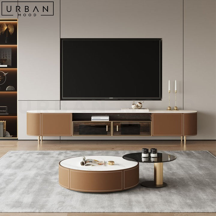 Add a touch of sophistication to your TV viewing experience with our FUHRMAN TV cabinet, where modern style meets premium craftsmanship. Crafted with an internal pine wood structure with a luxurious saddle leather finish, this TV cabinet stands upon gold legs, adding a touch of opulence to any modern, contemporary, or hotel-inspired living room space.