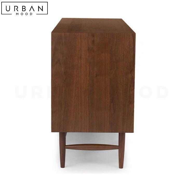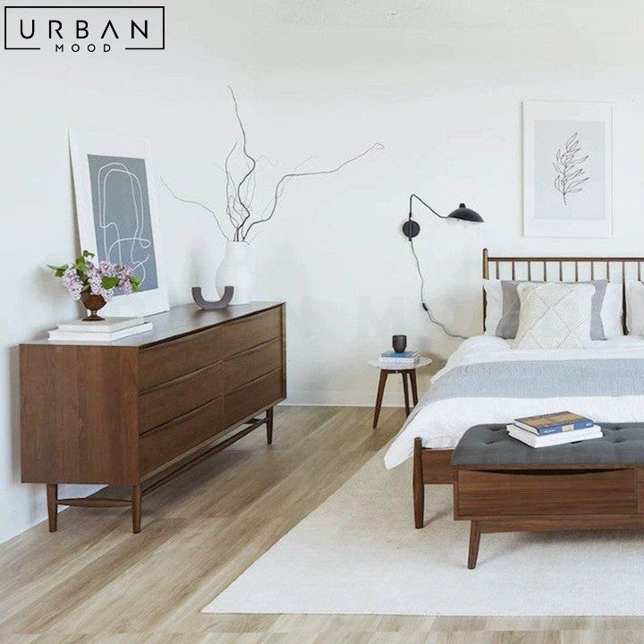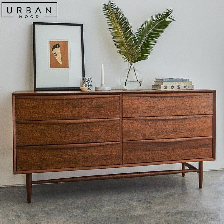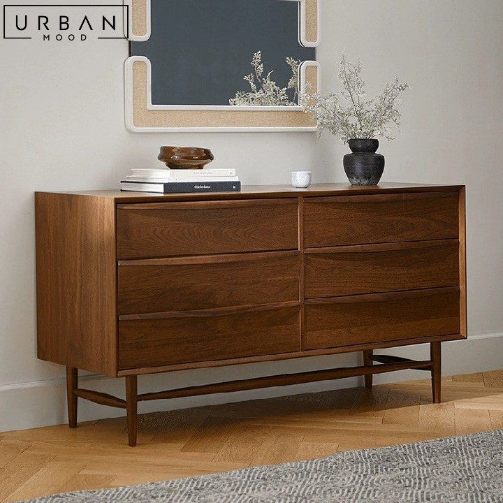 Upgrade your bedroom storage with our MARTINA chest of drawers. Crafted with multi-layer solid wood and framed in a rich walnut wood veneer, this chest combines durability with a sophisticated look. Its modern design features clean lines and a sleek finish, adding elegance to any contemporary foyer, living room, or office.