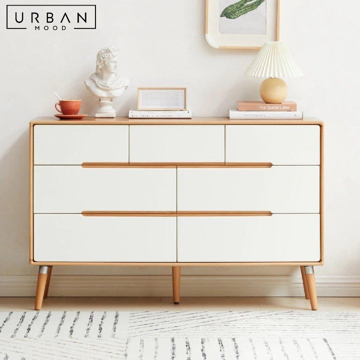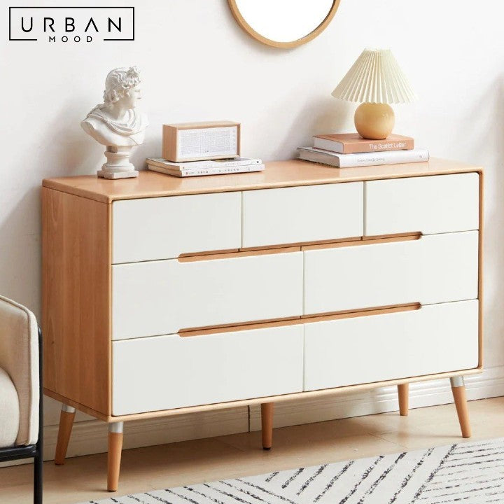 Bring a touch of Scandinavian chic to your bedroom with our MATTI beech wood chest of drawers, featuring natural oak and crisp white doors. The seven spacious drawers provide ample storage for your clothing and personal items, while the clean lines and minimalist aesthetic create a calm and serene atmosphere. Crafted from high-quality beech wood, this chest of drawers is both durable and stylish, perfect for those who value functionality and Nordic-inspired design. A beautiful addition to any bedroom.