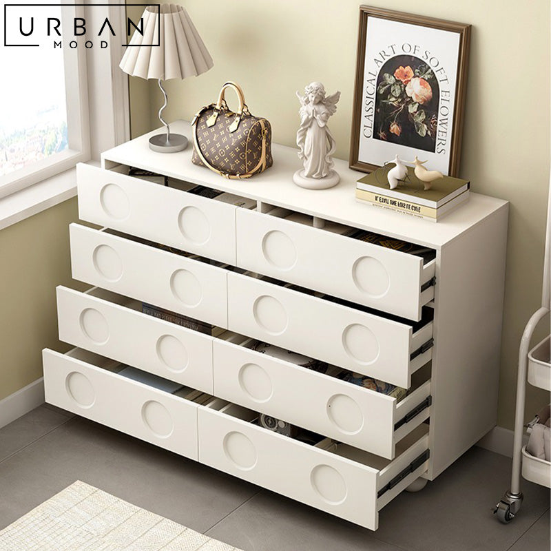 A stylish and efficient storage for any modern or minimalist home, our NEGAN chest of drawers is crafted from durable high-density fiberboard with a smooth matte black or white finish. The drawer doors showcase a simple yet distinctive circular motif which adds character and charm to the design. With 4 spacious drawers, the chest of drawers is perfect for storing clothes, linen or any other items you wish to keep close by. The drawers are designed with easy-glide metal runners for smooth opening and closing, and the chest is supported by rounded ball bearings for a modern look. Place this chest of drawers in your bedroom, hallway or living room and keep your space tidy, while adding a modern accent.