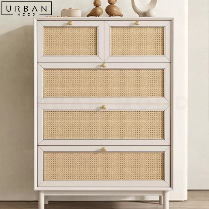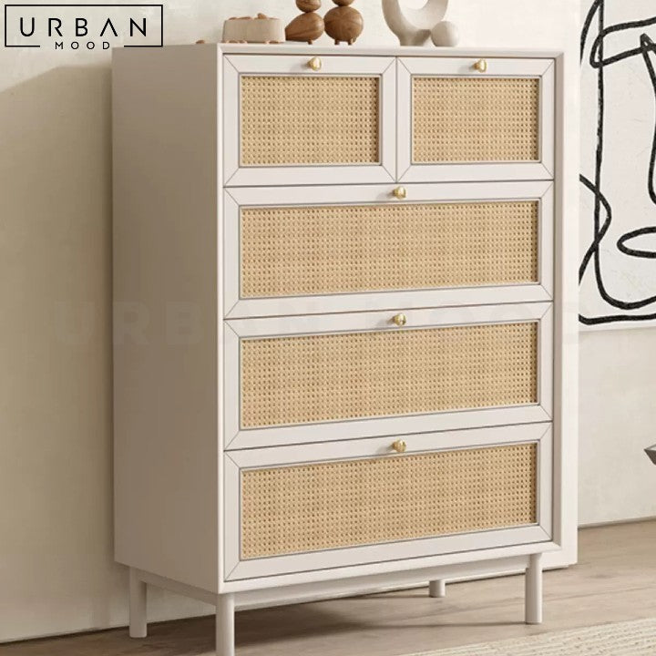 Organise your space with our OLIVIA cabinet, crafted from high-quality pine wood and adorned with rattan details. This storage solution adds a touch of Japandi flair to any room. Its spacious drawers offers practical storage solutions while enhancing your decor. Perfect for organizing essentials in style, this cabinet will complement minimalist, Japanese, Scandinavian, or farmhouse inspired interiors.