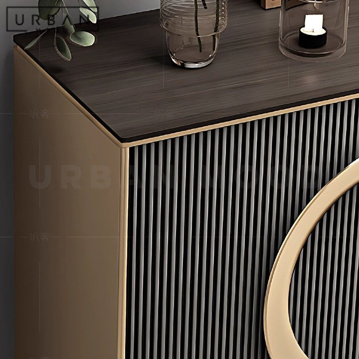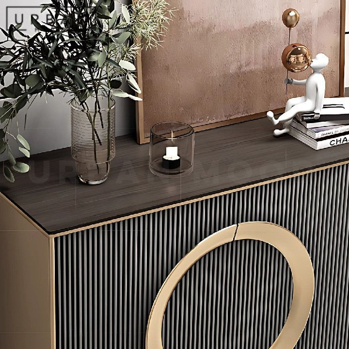 Our TRISTANA buffet showcases a radical design for a refined storage solution. Built with North American oak wood, stainless steel hardware, and a durable sintered stone surface, this cabinet offers style while ensuring timeless resilience for classic and modern homes. Carbon steel legs provide sturdy support and a sleek contrast to the warm wood tones.