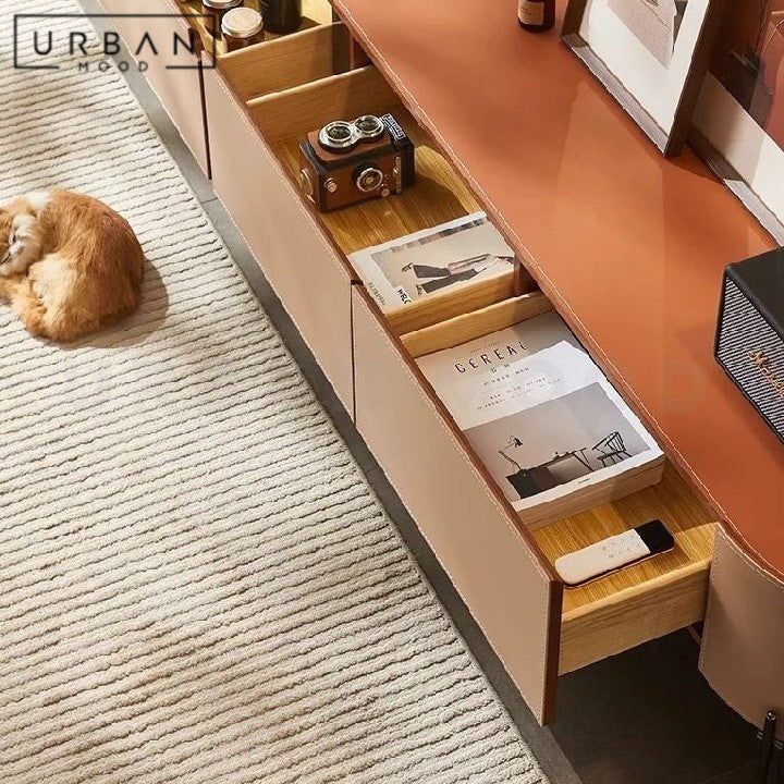 Our ZEQ TV cabinet blends contemporary design with premium craftsmanship. Featuring saddle-leather veneer fronts and panels, its rich texture adds warmth and depth to any living space. Built with a solid wood multi-layer board structure and supported by powder-coated metal legs, it offers durability and stability for any modern or contemporary lounge spaces.